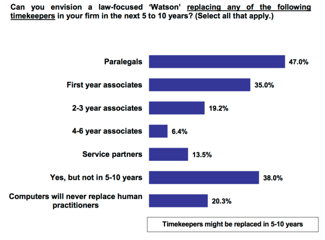 Σύμφωνα με την έρευνα, εντός των επόμενων 10 ετών, οι νέοι δικηγόροι και οι βοηθοί δικηγόρων (paralegals) θα μπορούσαν να αντικατασταθούν σε μεγάλο βαθμό από υπολογιστές τύπου IBM - Watson.