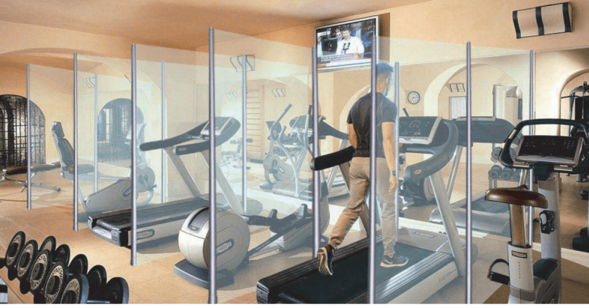 - απόσταση τουλάχιστον δύο (2) μέτρων ανάμεσα στα όργανα αερόβιας άσκησης (π.χ. διάδρομοι, ποδήλατα, ελλειπτικά κ.λπ.) ή κατασκευή ακρυλικών υαλοπινάκων που θα βρίσκεται έμπροσθεν των οργάνων και καθ’ όλο το μήκος αυτών ιδανικά και με επάνω καλυπτικό τμήμα (οροφή) το οποίο θα καθαρίζεται με αλκοολούχο αντισηπτικό διάλυμα πριν την χρήση του από τον επόμενο αθλούμενο.